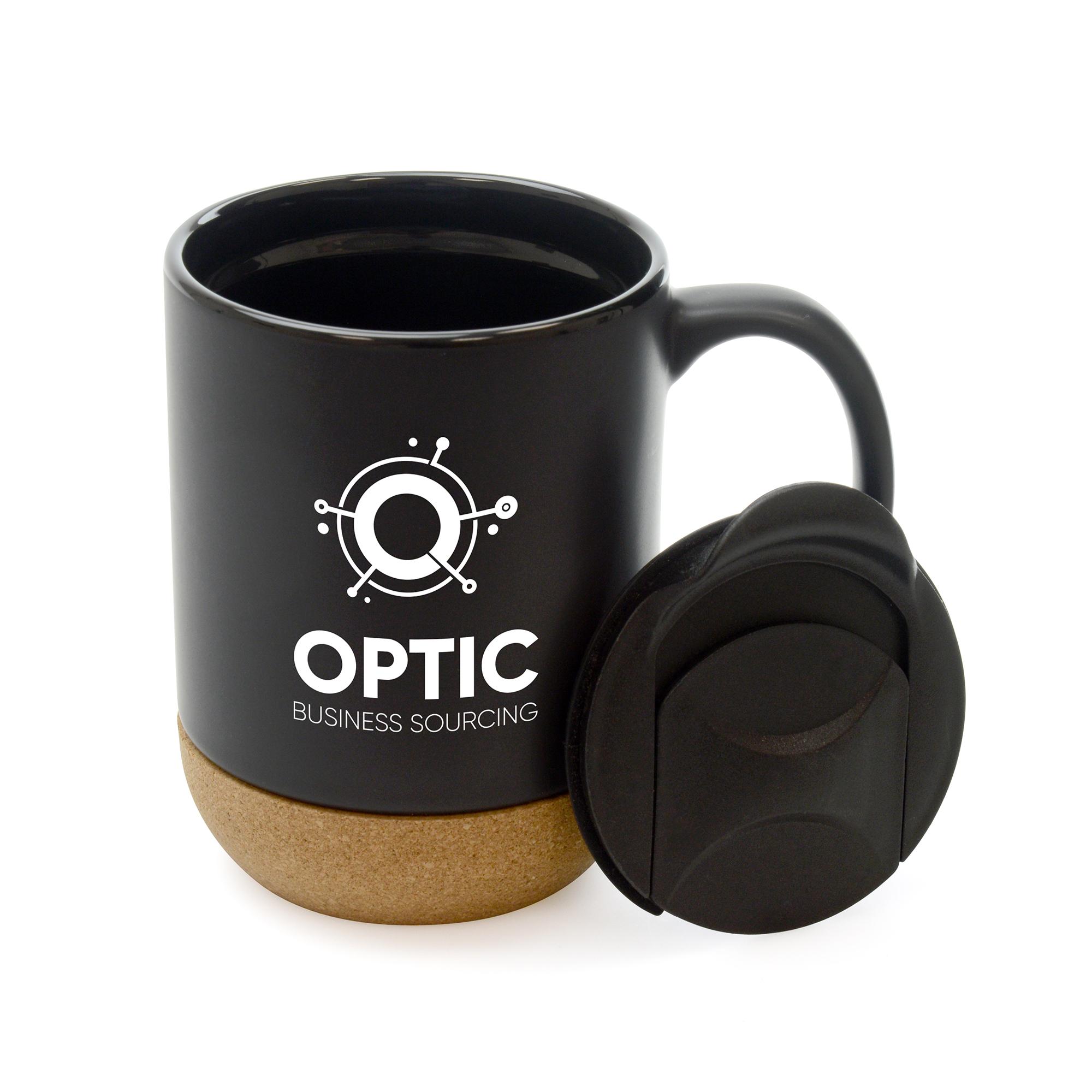400ml matt black ceramic travel mug with a naturally insulating cork base, large handle, push-on PP lid with sliding sipper and silicone seal. BPA and PVC free. Available in black. Size: 120 x 90 x 130mm dia. Print: 40 x 45mm.