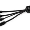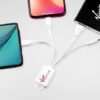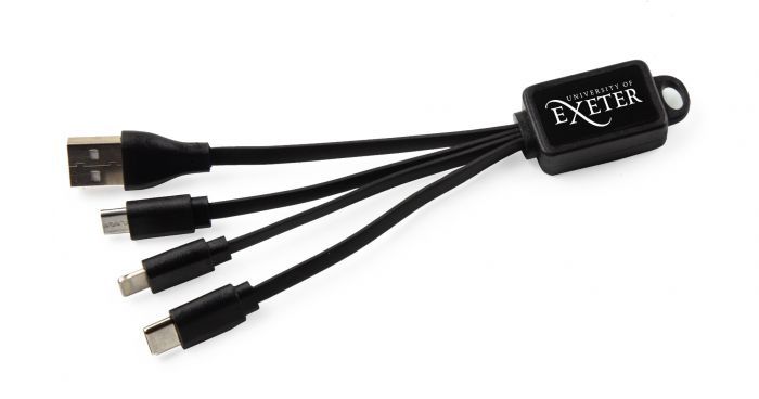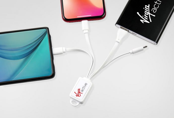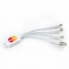 The Promotional 3 in 1 Charging Cable is a multi cable in a clean white or black colour that allows for connection to a wide variety of devices. There are 4 connectors, USB, USB-C, lightning and micro-USB, allowing for connection to all modern smartphones as well as tablets and more.
